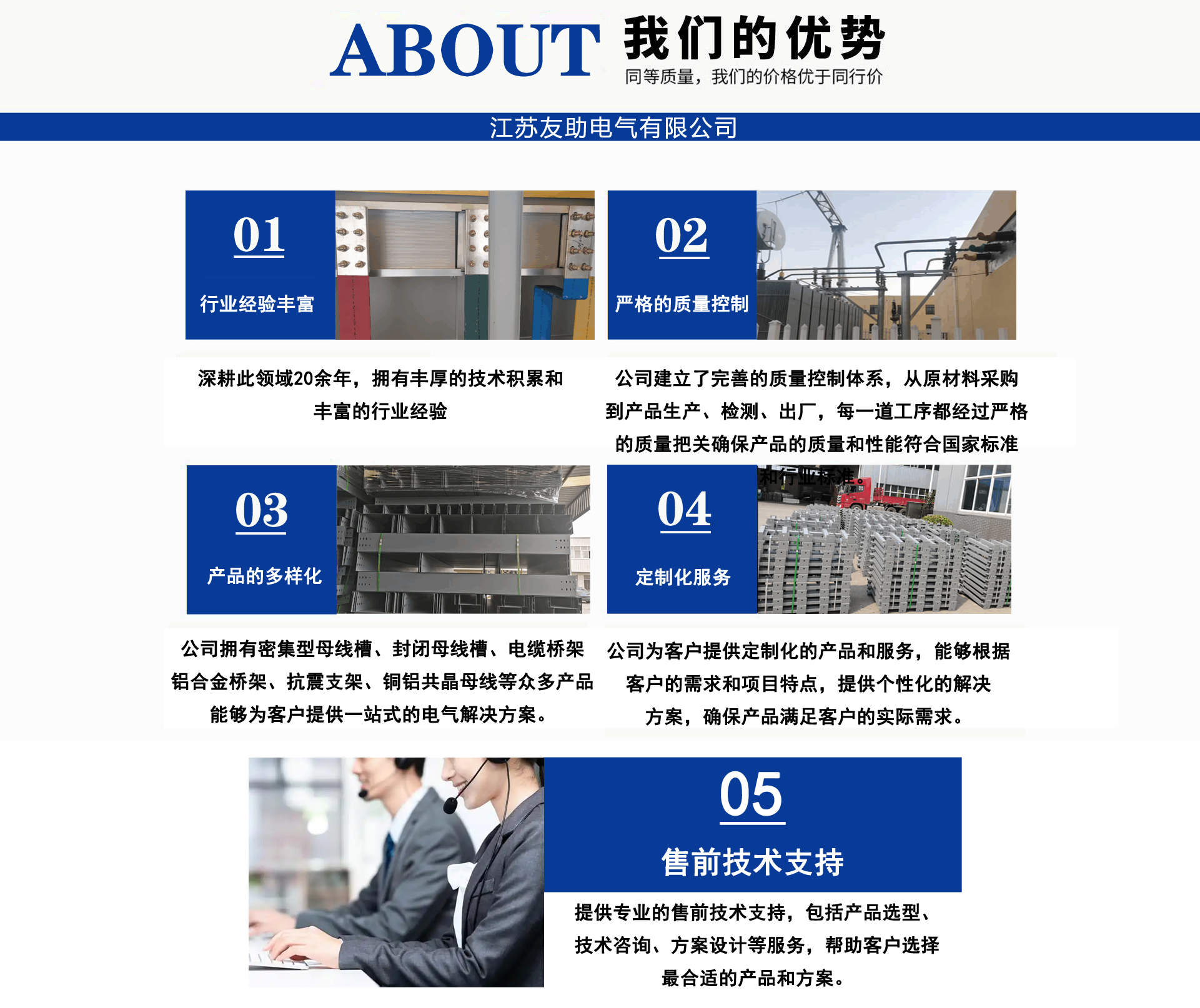 江蘇友助電氣有限公司地處中國(guó)工程電氣生產(chǎn)基地-一江蘇省揚(yáng)中市。經(jīng)營(yíng)范圍:電纜橋架,母線槽(橋),管型母線,銅軟連接(伸縮節(jié)),高低壓開(kāi)關(guān)柜,配電箱,抗震支架產(chǎn)品系列?!」咀谥迹嚎蛻糁辽稀R殉晒榻K二十屆省運(yùn)會(huì)會(huì)場(chǎng)-泰州體育館,南京寶龍商業(yè)綜合體,張家口百兆瓦風(fēng)電場(chǎng),濟(jì)源市婦幼醫(yī)院,威海市未來(lái)科技園,湖北皇恩燁新材料科技有限公司,南京中央路小學(xué),南通中天大酒店,新疆新安特鋼有限公司,河北省送變電有限公司,南京南微醫(yī)學(xué)研發(fā)基地等多項(xiàng)工程配套服務(wù),我們?cè)概c您精誠(chéng)合作,互利共贏!公司技術(shù)人員深耕橋架,母線領(lǐng)域30年,為您提供橋架,母線槽疑難問(wèn)題解決方案。母線槽不論每相是單排,雙排,三根排重疊,不管有多少個(gè)水平彎、垂直彎,轉(zhuǎn)接排在發(fā)貨前預(yù)裝一遍,確保尺寸無(wú)誤。到現(xiàn)場(chǎng)直接擰螺絲,效率高,橫平豎直,規(guī)規(guī)矩矩,符合標(biāo)準(zhǔn),供電局,業(yè)主,監(jiān)理,驗(yàn)收易通過(guò)。供貨周期3-7天。為了讓尊貴客戶您,設(shè)備安全通電,高枕無(wú)憂。我們提供如下售前售中售后服務(wù): 售前:免費(fèi)技術(shù)支持,咨詢。 售中:免費(fèi)現(xiàn)場(chǎng)精確測(cè)繪、設(shè)計(jì)。 售后:安裝服務(wù),免費(fèi)指導(dǎo)。 質(zhì)量是生命,客戶是源泉。承諾客戶的,一定全力做到。讓我們一起進(jìn)步!...